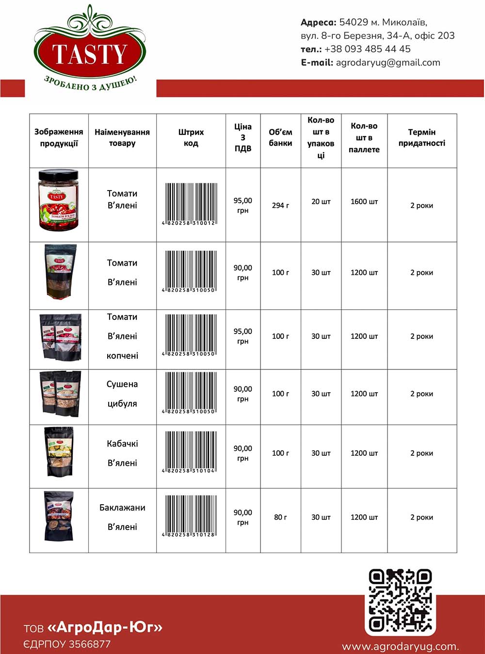 В каталозі представлені в’ялені томати в сухому вигляді в пакетах та консервовані томати в банці. Обирайте варіант, який вам до вподоби. Продукт містить багато вітамінів, мінералів та інших поживних речовин. Томати в'яні можна використовувати просто в кулінарції та в лікувальних цілях. Завдяки середній колорійності, продукт можна вживати навіть при дієті.