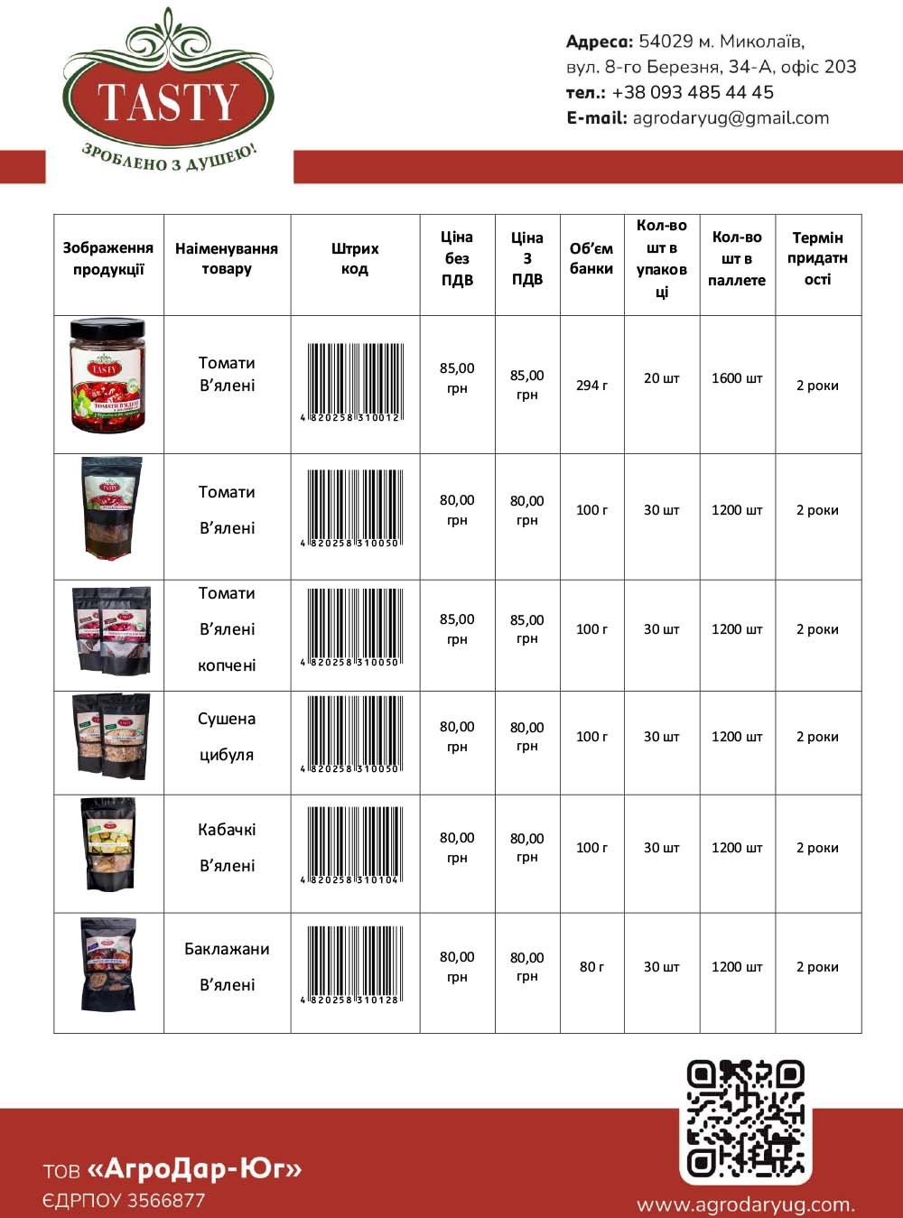 В каталозі представлені в’ялені томати в сухому вигляді в пакетах та консервовані томати в банці. Обирайте варіант, який вам до вподоби. Продукт містить багато вітамінів, мінералів та інших поживних речовин. Томати в'яні можна використовувати просто в кулінарції та в лікувальних цілях. Завдяки середній колорійності, продукт можна вживати навіть при дієті.