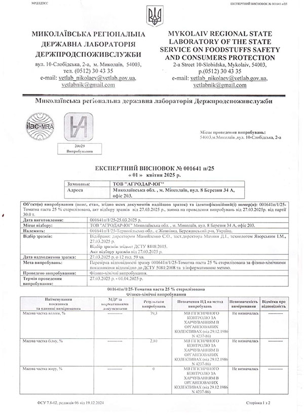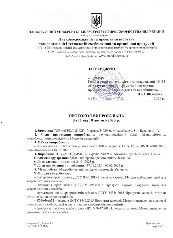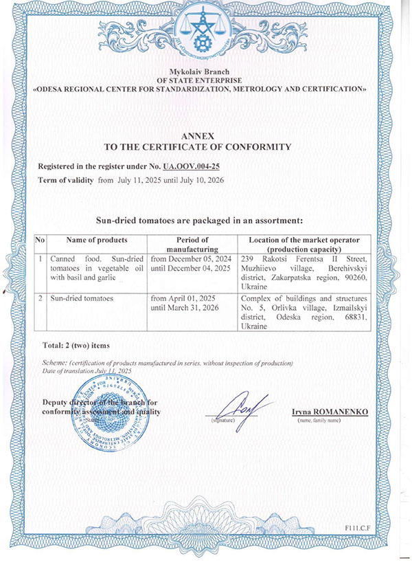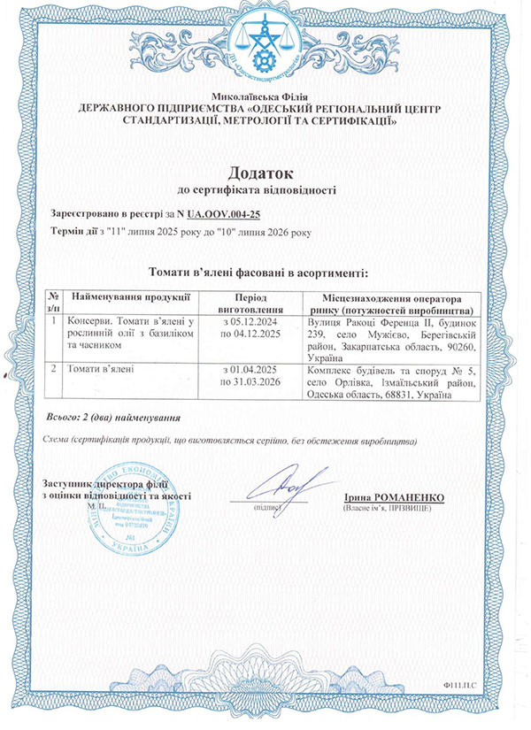 Продукт 100 % натуральний, стерилізований, не містить консервантів, барвників, підсилювачів смаку, антиоксидантів. Для приготування томатів в’ялених використовуємо олію соняшникову, рафіновану, дезодоровану, сіль морську, харчову, натуральні трави та часник.